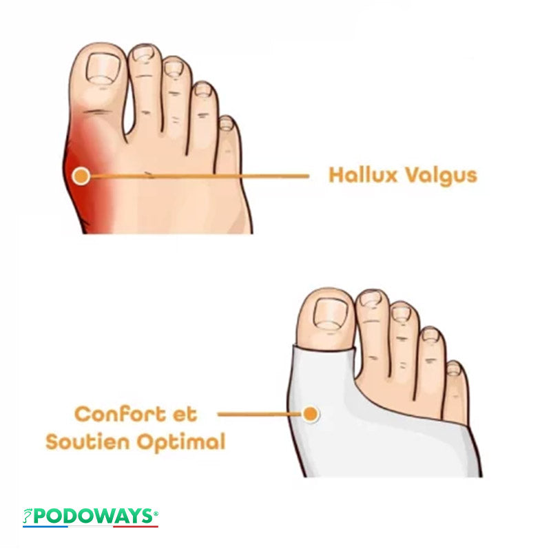 Les Manchons Orthopédiques de Podoways® sont conçus avec un gel relaxant spécial pour orteils qui apporte un véritable soulagement au quotidien pour celles et ceux qui souffrent d’hallux valgus.